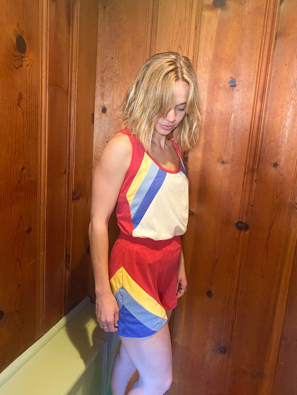 It's true, we'll put colorblocked panels anywhere we can squeeze them in! | Fit / Sizing Fits true to size. Women’s sizing: XS-S-M-L-XL-2XL-3XL-4XL-5XL | Scoop neck tank with three angled contrast color panels across front. Slightly sheer cream jersey. Signature locker loop at back neck. | Care / Content / Origin Machine wash cold, lay flat or hang to dry 60% cotton / 40% polyester | Manufactured in the USA